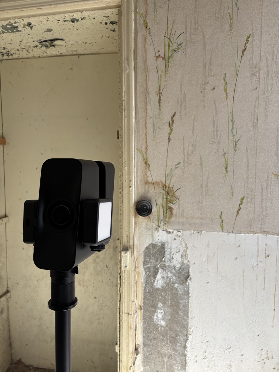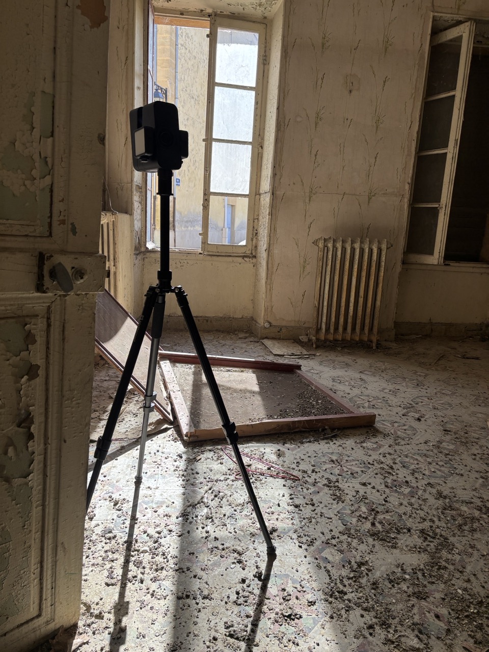 - Scanner 3D monté sur un trépied effectuant un relevé laser dans un bâtiment en rénovation à Marseille.