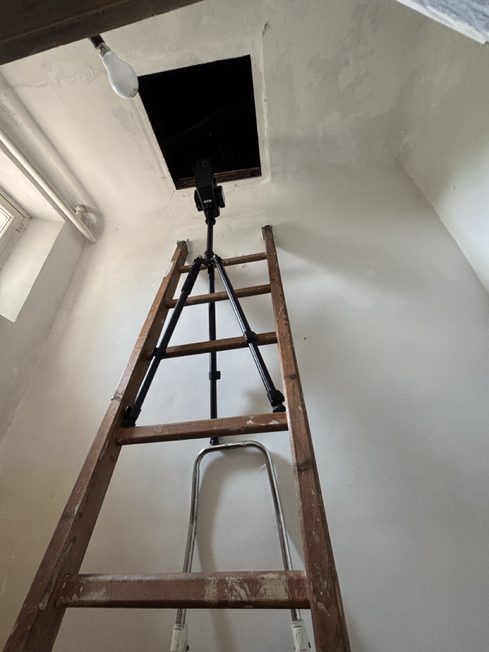 - Scanner 3D installé sur un trépied à côté d’une échelle pour réaliser un relevé laser.